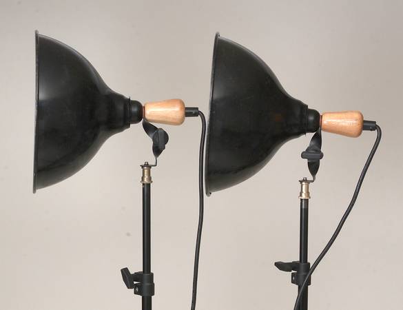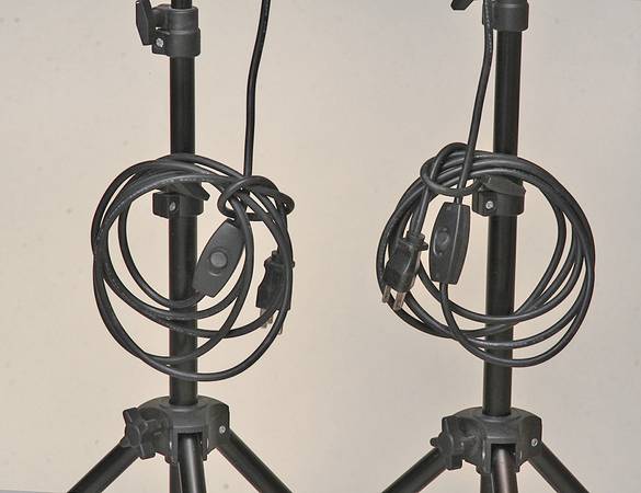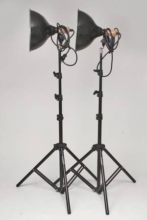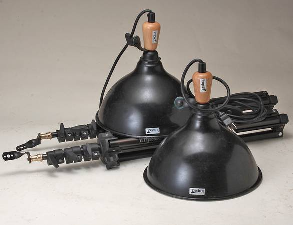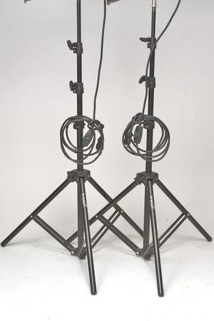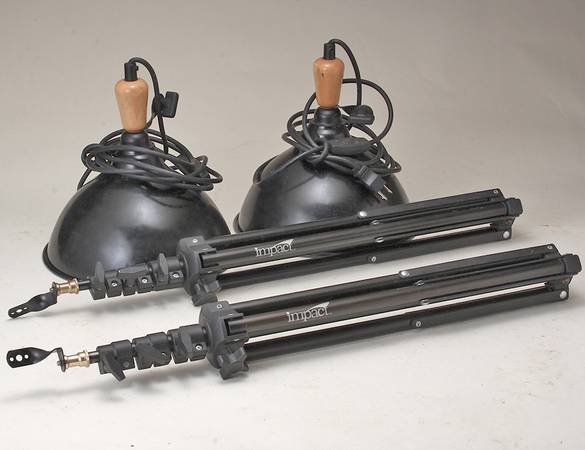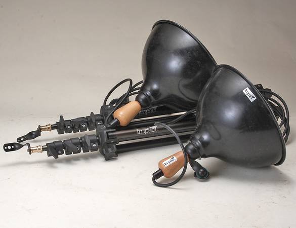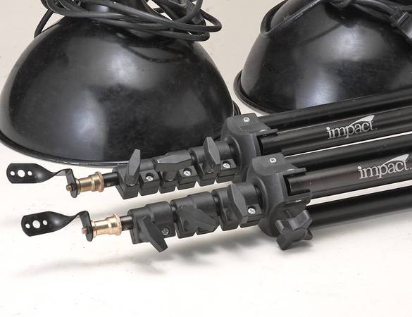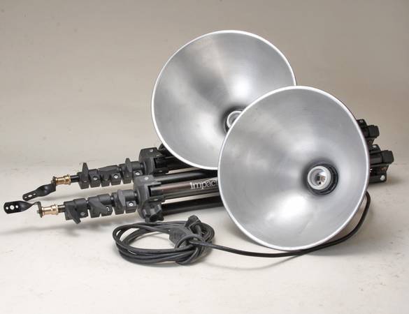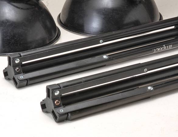 Impact Two-Floodlight Kit with 6' Stands that's built around the Impact 10" reflector unit with a high-heat ceramic socket. Each light's wooden control handle stays cool, and each light has a cord with in-line switch. The kit includes two 6' black aluminum light stands. Folds down to just 26.3"