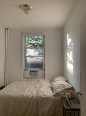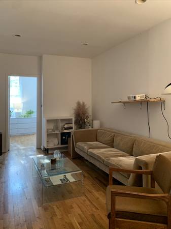 The bedroom is furnished but can be unfurnished. Flexible move-in date and length of the sublet. It could potentially extend into a long-term living situation if it feels like the right fit. The room has a closet and fits a full size bed, a bedside table and a dresser. Not ideal for work from home—I don't think you can comfortably fit a desk and a full size bed in the room.