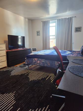 Very big room full furnished with double queens size bed with new matress,TV and more.Bus stop is outside few steps from the building.In 10 min with bus is 74 Roosvelt with all the train conection.1100/month plus one deposit.Are incluted the internet and electricity.