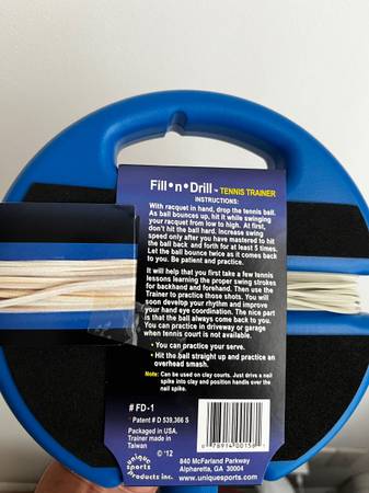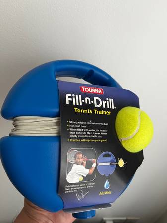 Brand new Fill n Drill tennis trainer. This is used to practice tennis swings, can be used in park, driveway or courts. $10 cash only