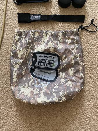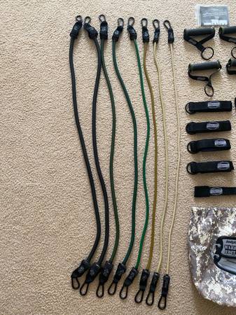 The Strong Man XT Warrior Set takes the Basic Strong Man Set up a notch and adds a military theme. It features 20 total components that include 8 resistance bands that can all be combined to produce a maximum of 282 lbs.