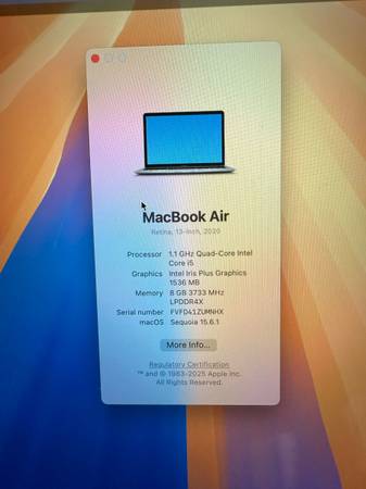MacBook Air 13” 2020/8GB RAM/256GB SSD/Fully Functional/Excellent Battery/Apple charger