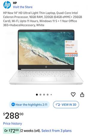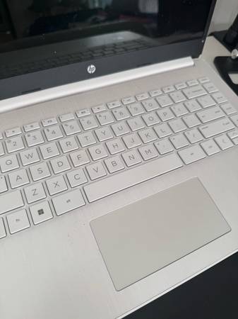Sleek and fully loaded white HP laptop computer, excellent condition (hardly used). All specs are listed in the photos. Original price $288 on Amazon. Included in the listing price is a faux leather laptop sleeve and a mouse holder (see photos for those as well). One small hairline crack in the lower left corner. Everything works perfectly — great machine for a student, traveler, or remote worker!