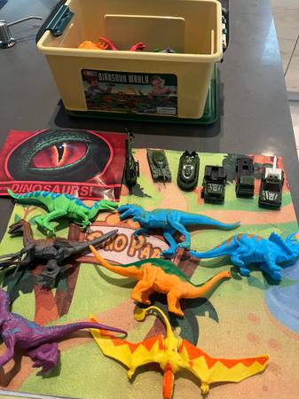 Our Dinosaur playset includes 15 kinds of dinosaurs (t-rex, stegosaurus, triceratops, brachiosaurus, etc.), 8 kinds of vehicles. 1 soft foldable map that can create the dinosaur world, 1 colorful dinosaur booklet and 1 storage box for easy to store.