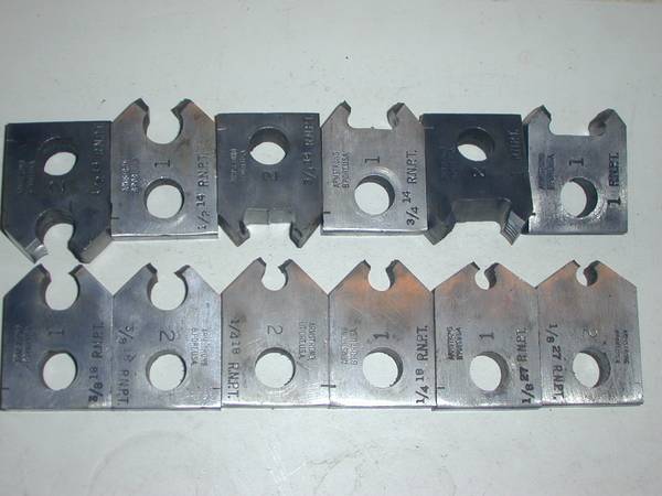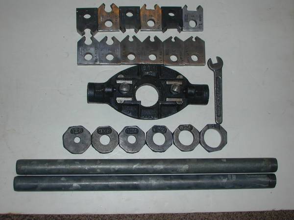 This vintage set is excellent - all original and in very clean condition. It includes dies for all NPT sizes: 1/8, 1/4, 3/8, 1/2, 3/4, and 1". Also included are the die holder, pipe handles, adjusting wrench and the original instruction sheet.