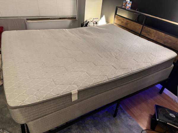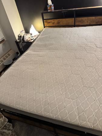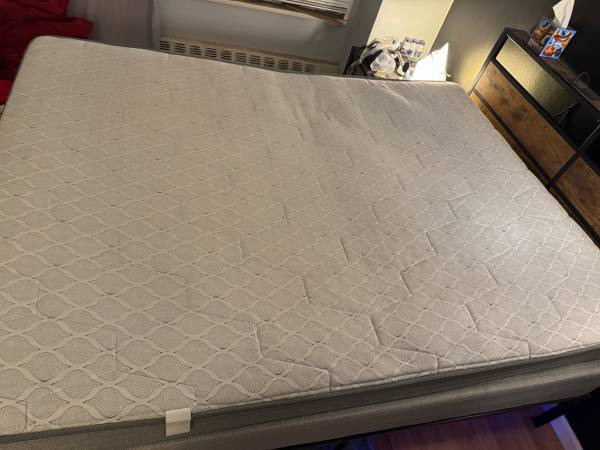 Free queen sized mattress and box spring. Pickup only. Used, no major stains, no smell. From bob’s furniture. Box spring is solid wood, non-compressible. Bed frame NOT included.