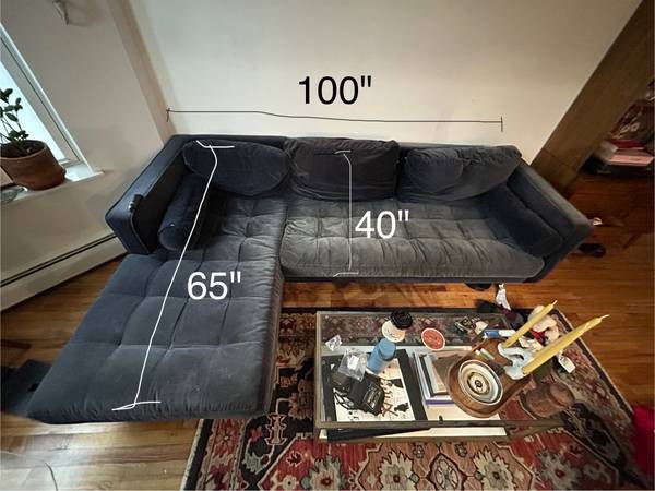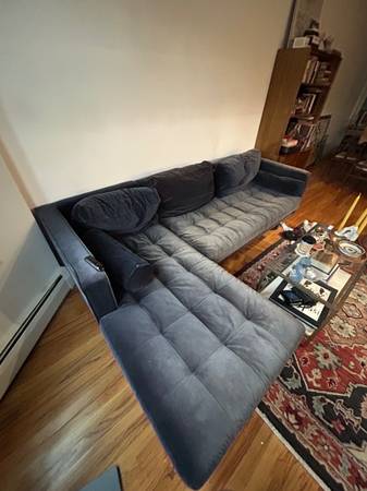 blue sectional with trendy mid mod design cues. Quite nice for the price, no structural flaws but some cosmetic damage and could probably use a cleaning but hey, its free! Pickup only, first come...