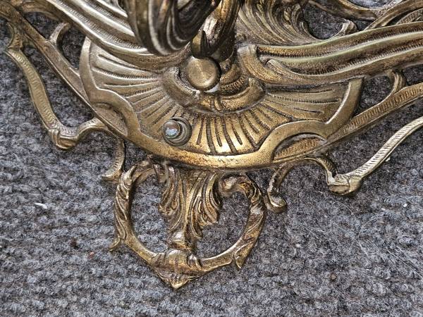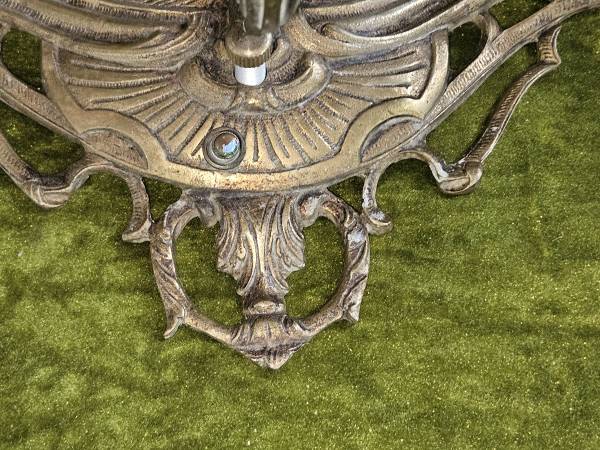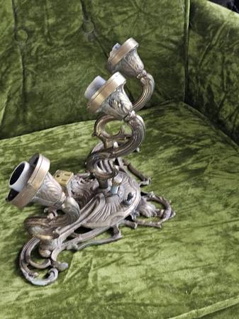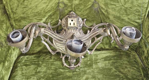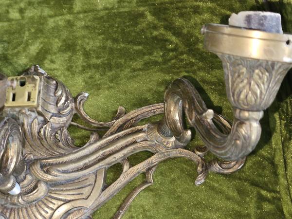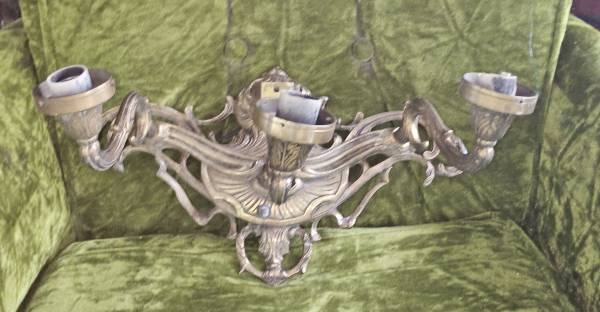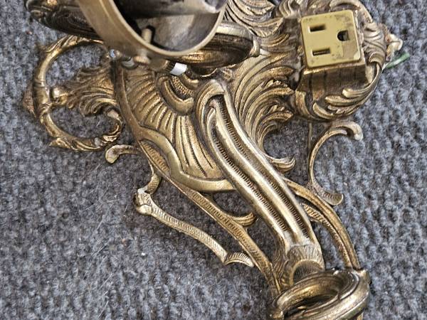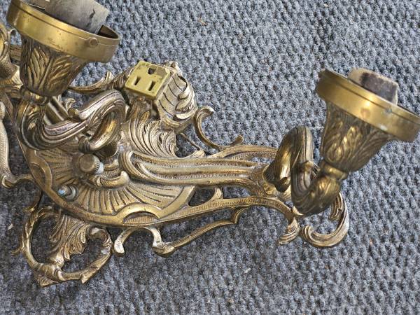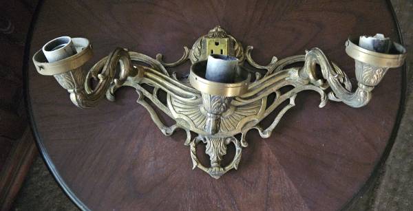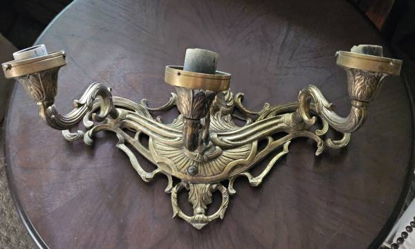 Estate Rescue ornate 3 arm brass wall sconce - electric with switch and outlet on top - could be made into a candelabra and not electrified - measures 14 1/4" long x 8.5" tall x 8.5" deep. Can Deliver on Staten Island