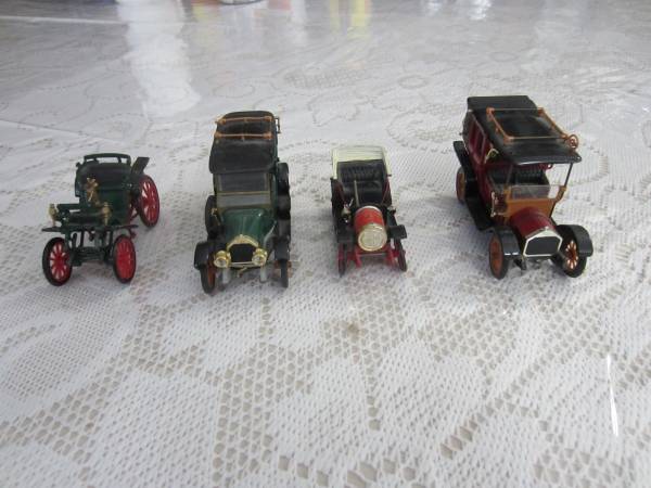 Found in storage, four vintage replica toy model cars. Great for collectors of die cast toys.
