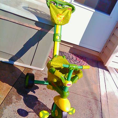The The unique Fisher Price Green Smart Trike provides a safe way of traveling from an early baby age and grows with your child from the age of 10 months to the age of 30 months. Parents steer the trike with the unique, telescopic, adjustable handle and the built in clutch gives the option of ride control to either the parent or the child. Fitted with a safety harness, and for 15 months onwards with a seat belt, the Fisher-Price Green Smart Trike provides a safe and comfortable way for getting your child around. The extra-safe padded seat ensures enhanced baby comfort and the trendy fun canopy and parent bag makes every ride a true adventure. Get the trike that is built to last- the Fisher Price Green Smart Trike!