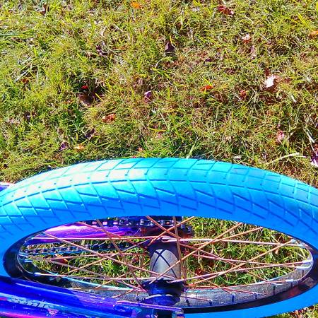 Blue tires and black rims with purple spokes