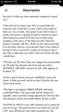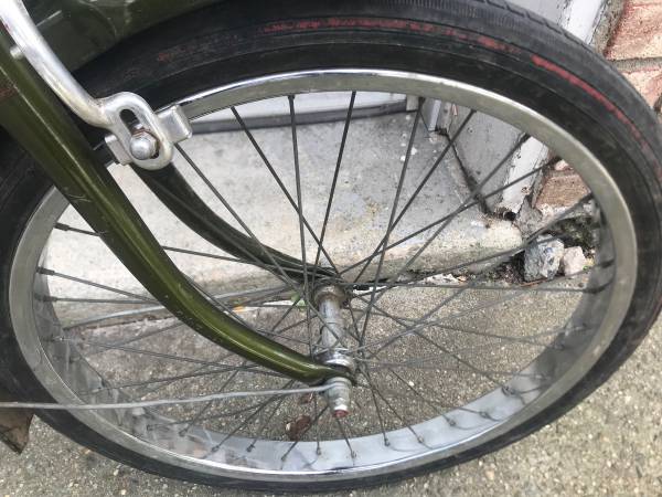 This is an all original 1969 Raleigh three speed folding bike. The bike has been stored in a dry free basement, the bike is rust free island close to mint condition just a few scratches on the fenders . The bike has all the original parts that came from the factory including the original rims and tires which still hold air. You would be hard-pressed to find a bike in this kind of condition for the price. The bike can be picked up on Staten Island Tottenville section.