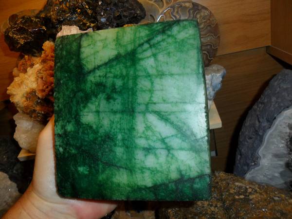 Exceptionally, Gorgeous and Beautiful Rare 10280 cts Natural Brazilian Green Emerald Floral Design Hand Carving. Brazilian emeralds are exceptional with their vibrant rich green color. A good quality Brazil emerald will display a natural glow, rich color, and good transparency which adds to the value of this gemstone. That said, their color lacks the rich intensity that Colombian emeralds generally have. A good quality Brazil emerald will display a natural glow, rich color, and good transparency which adds to the value of this gemstone. That said, their color lacks the rich intensity that Colombian emeralds generally have. Brazil also produces the rarest of emeralds and very rare six-spoke star emeralds. As a love and devotion stone, its ideal. There is also a very strong connection to physical fertility, so if you want to bring children into the world wear an Emerald to attract the soul best suited to your family. This attribute of Emerald increases in spring when Earth herself is rich with rebirth. This Exceptional Floral Carving is Just Simply Breath Taking and Very Rare. These Pictures were taken out side and Shows the Brilliance of This Rare 10280 cts Natural Brazilian Green Emerald Floral Design Hand Carving. Measurements: 5.27” x 4.72” x 2.28” Weight: 4.52 lbs. Price: $325.00 Shipping and Handling: $35.00 Very Well Kept in My Gallery Cabinet Collection. Visit:www.paulsgems.com