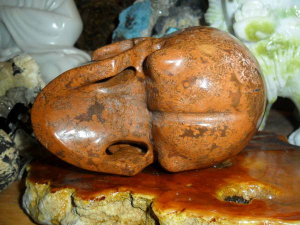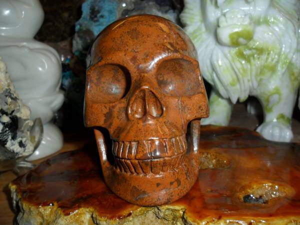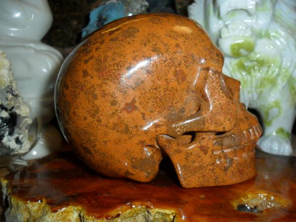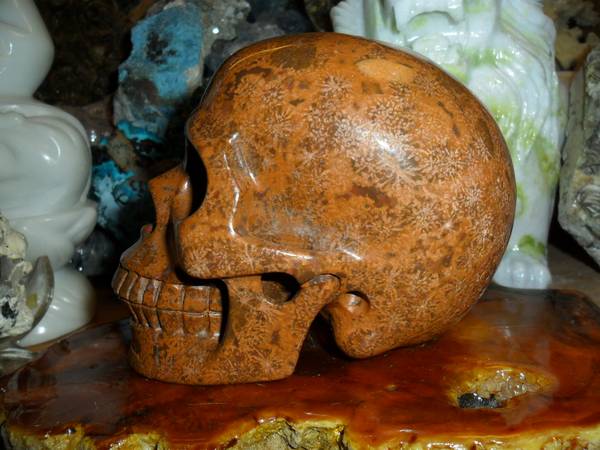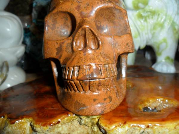 Exceptional and Beautiful Large Gold Star Muscovite Stone Crystal Skull Very Rare. Gold Star Muscovite is a metallic golden crystal that forms in layered plates. Opaque and pearly in appearance, Gold Star Muscovite forms a layered, six-pointed star pattern. Named after the Muscovy province in Russia, Muscovite is the most common form of Mica. Muscovite is a powerful healing and grounding crystal that can help one see things more clearly and make better decisions. An ideal stone for those who are in pursuit of learning or wanting to connect with their higher self, muscovite can help you access knowledge of all kinds and obtain wisdom. Measurements 5.1” x 3.3” x 3.9” Weight: 2.7 lbs. Pictures Show all Angles of This Beautiful Skull Carving. Origin: Skullis of China. Price: $195.00 and Shipping and Handling: $25.00 This Skull is Simply Breath Taking. Visit:www.paulsgems.com