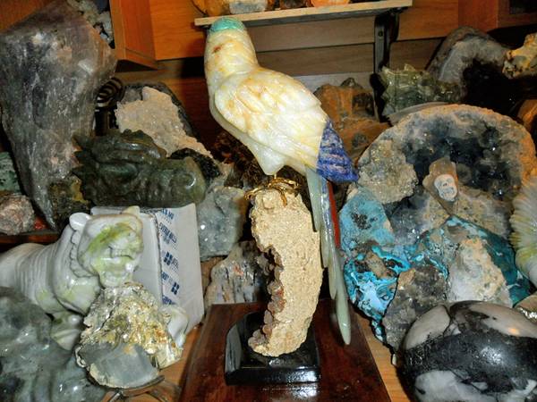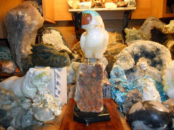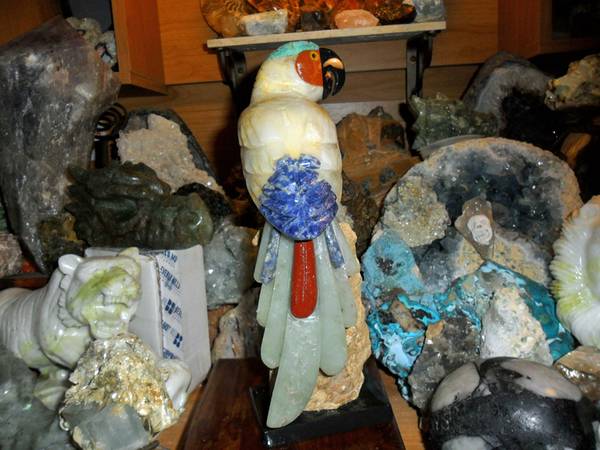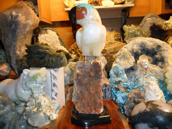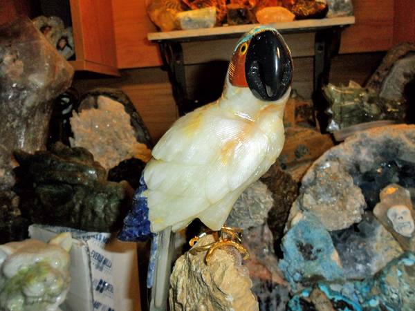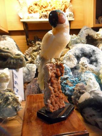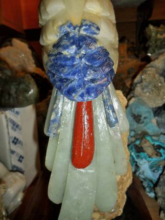 Beautiful Natural Huge Mineral Gemstone Macaw Parrot Bird Carving. This Handmade macaw was carved from hard-type rocks. The bird carving is hand carved and come from South America. The Beautiful Macaw stands on an Calcite Crystal Cluster Perch. The body was carved from Agate Quartz, Red Jasper, Chrysocolla, Sodalite, Serpentine, Onyx The Beak is Black in Color and Golden Yellow Eyes. Please refer to the photos below to visually appreciate the beauty of this Macaw Parrot. One of a Kind. Just a Breath Taking Carving. This Carving Been in My Collection Many Years and Very Well Kept in My Gallery Cabinet. Height: 10 1/2” Tall on Base. Base is 5 1/2” Tall Wide and 3 1/2” Thick. Bird 9 1/2” Tall 3” Wide, and Wing to Wing 3” Length of Bird from Tail to Beak around 10” Total Weight: 3.4 lbs. Price $280.00 Shipping and Handling $45.00 Origin: Peru. Worth so much More. Pictures shows all Angles of This Beautiful Bird Carving. Just a Breath Taking Bird Carving. Exceptional for Bird Collectors and For Home and Office Décor or Just to Add To Your Unique Collection. Visit:www.paulsgems.com