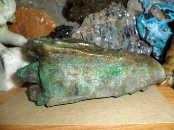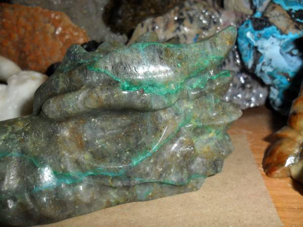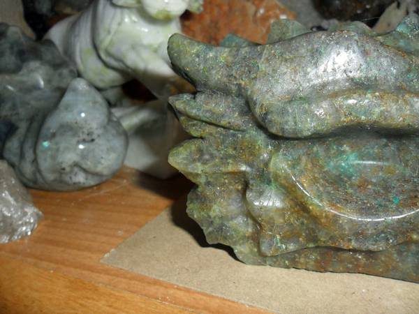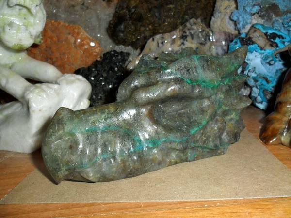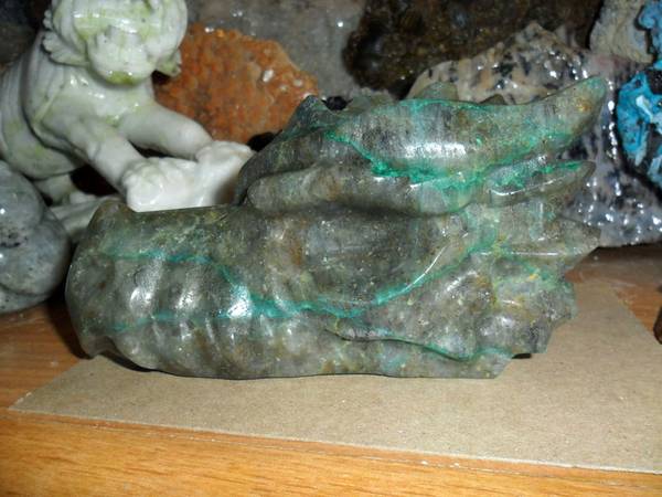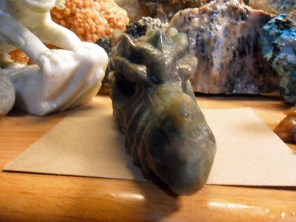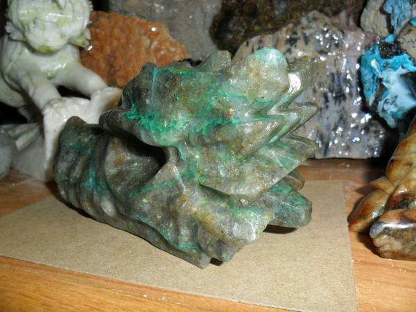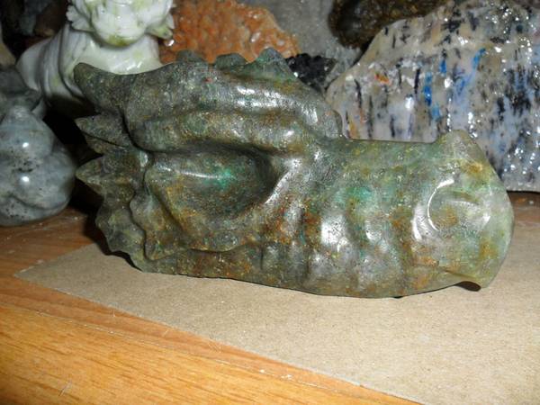 EXCEPTIONAL AND BEAUTIFUL EXTRA LARGE NATURAL GENUINE EMERALD GEMSTONE CRYSTAL DRAGON HEAD SKULL CARVING. Color: Emerald Green and Natural Stone. Origin: Brazil. A good quality Brazil emerald will display a natural glow, rich color, and good transparency which adds to the value of this gemstone. That said, their color lacks the rich intensity that Colombian emeralds generally have. Brazil also produces the rarest of emeralds and very rare six-spoke star emeralds. As a love and devotion stone, its ideal. There is also a very strong connection to physical fertility, so if you want to bring children into the world wear an Emerald to attract the soul best suited to your family. This attribute of Emerald increases in spring when Earth herself is rich with rebirth. Pictures Show All Angles. And Shows the Brilliance of This Rare Carving. Measurements: 6.2" Long, 3 1/4” Tall and 2 1/2” Thick. Weight: 2 lbs. Been in My Gallery Cabinet Collection Many Years. Price: $225.00 Shipping and Handling: $35.00 How often do you find a Top Quality EMERALD Dragon Carving. This Exceptional Dragon Skull Carving is Just Simply Breath Taking and Very Rare. You Won’t Find an Emerald Dragon Carving Skull Online. Visit:www.paulsgems.com