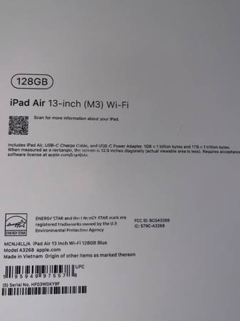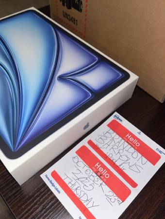 Brand new sealed iPad Air 13-inch with M3 chip, 128GB, WiFi, Blue color. Factory sealed, never opened. Retails for $799 + tax ($870 total). Need to sell today, priced to move. PRICING: $550 - Pick...