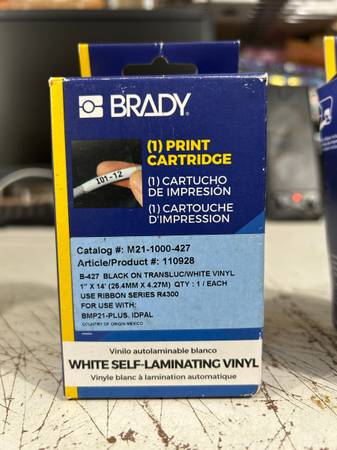 Brady Wire label Cartridge, Self-Laminating Vinyl , M21 Printer, 1 in W x 14 ft L, Black on White/Translucent Self-Laminating Vinyl Wrap Around Labels Brady Wire Label Cartridge m21-1000-427 Color:...