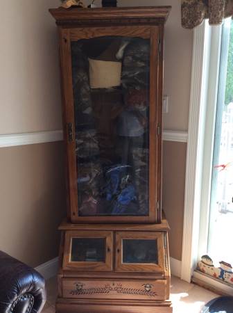 Holds 12 guns, has a drawer and light, carved wood, locks with key. Very good condition. Serious inquires only.
