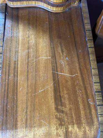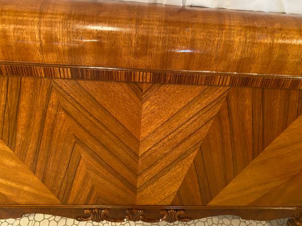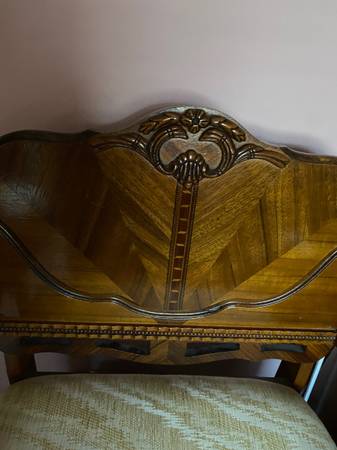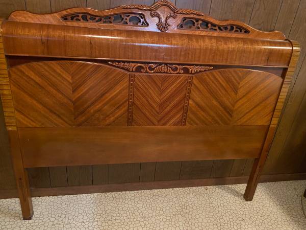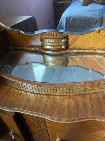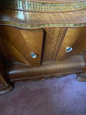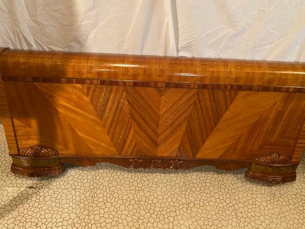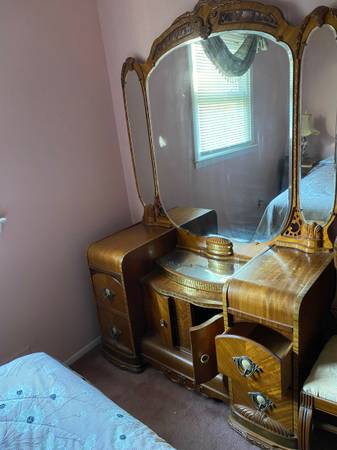 These are pieces from a beautiful 1940's Art Deco "Waterfall ' bedroom suite that belonged to my Grandmother. I am keeping the large Dresser, but I have no room for the Vanity with attached triple mirror, matching chair and Full size headboard ,footboard and bedframe .
