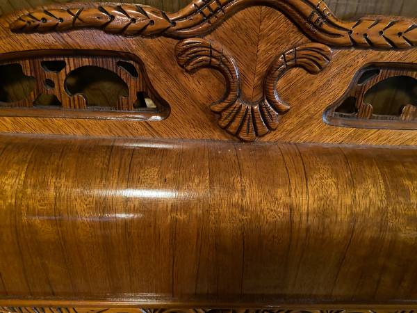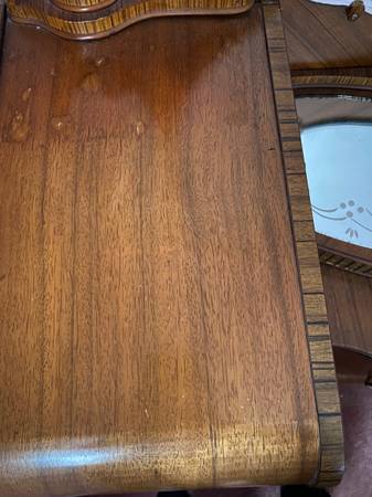 The workmanship on these pieces is outstanding. It has inlaid wood, ornate carvings and drawer pulls little, mirror tiles and an etched mirror on the center top. The lighting was better when I photographed the bed, and is more true to color. When I was little, I thought the Vanity must have belonged to a Princess.I could picture her sitting there combing her hair. I think this would look great in a Beauty Parlor.