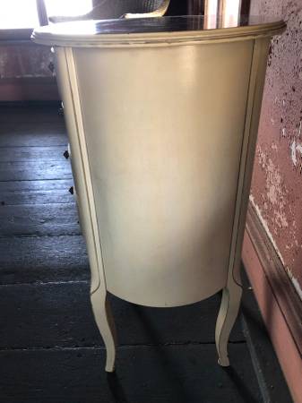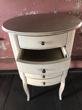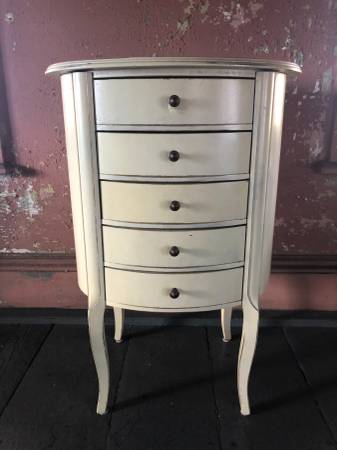 This elegant 5-drawer bedside table is the perfect size for narrow or small spaces, or as a bedside table. 5 Drawers means you can store your many personal items, such as jewelry, toiletries and books. It is used, but in very good condition. Well made with a cream colored painted finish.