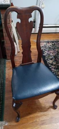Includes six Queen Anne upholstered chairs (2 captains chairs and 4 side chairs) with custom-made navy blue seats.