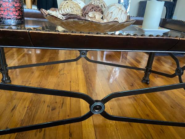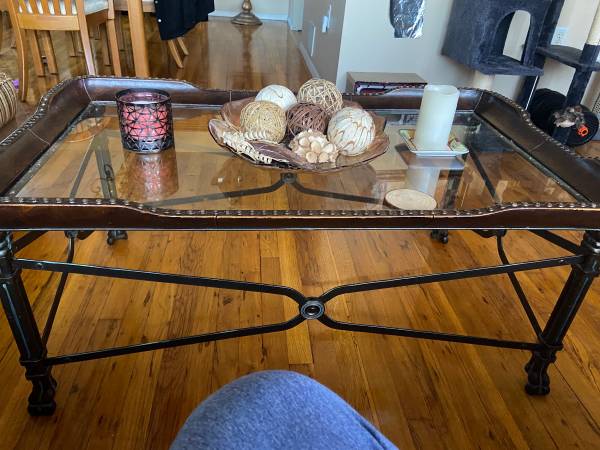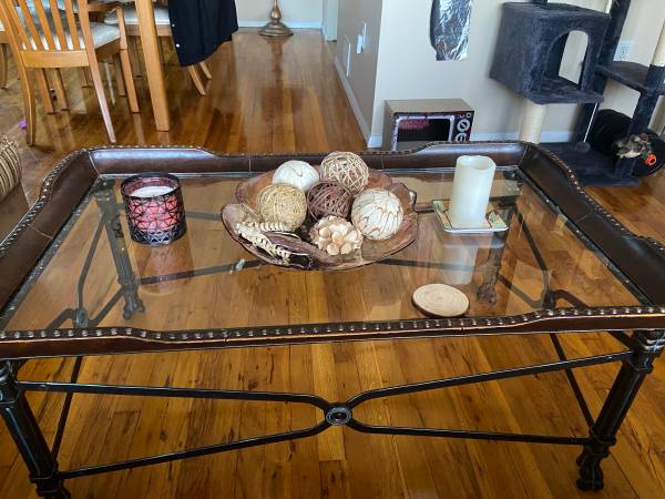 Glass, leather with studs, metal coffee table in excellent condition…selling it because I am downsizing. 45” wide 27” deep 19” high New lower price!!