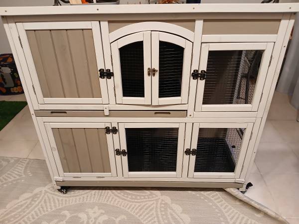 Brand new 2 story rabbit hutch, never used. Ramps included, assembled.