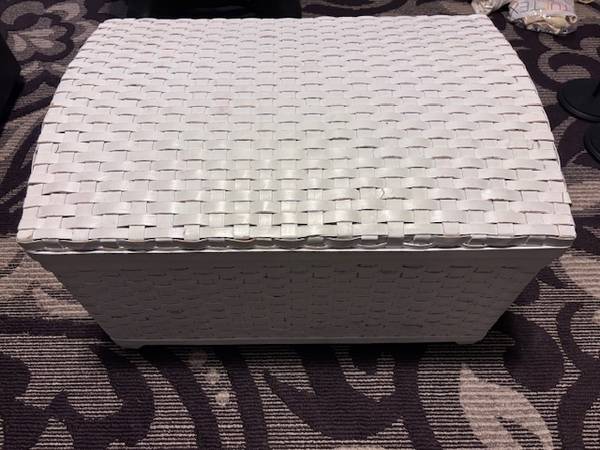 Wicker toy chest in white. Sturdy wood construction. Safety hinges allow you to open toy chest to any position and prevents it from closing suddenly. Has removable, washable inside liner.