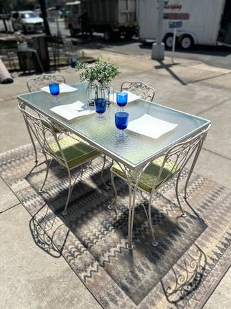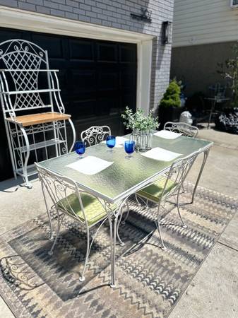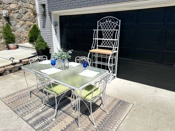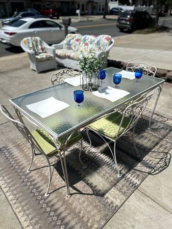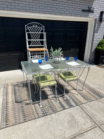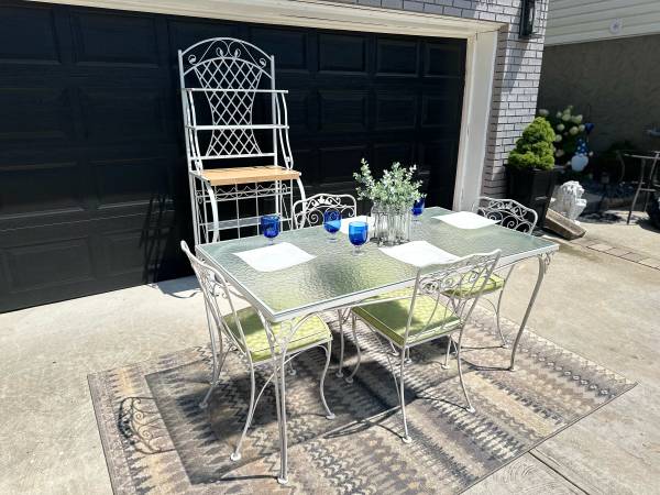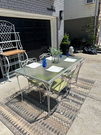 Yes it’s available! Please don’t ask and never reply! Up for sale is a 6 piece outdoor patio set that includes 4 chairs, one table and a bakers rack for additional storage. The glass is in excellent shape the cushions could use a recovering to your liking. Local delivery can be arranged. Check out my other postings for additional furniture. The dimensions of the table are 32x60. The table can easily accommodate 6 chairs.