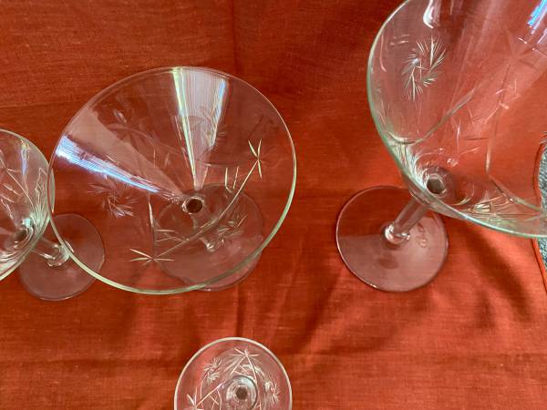 This is a early to mid 1960's set of Cut Crystal Stemware. They are in excellent condition, and were kept in a China closet in a smoke and pet free home. The pattern has stars and lines. It has a more Mid Century Modern, sleek linear design than the etched floral designs of the 1930's and 1940's. If you do not have beautiful crystal stemware, here is your chance at about the same price as simple glass.
