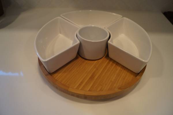 Selling a Food Network brand Chip and Dip Lazy Susan. Originally was a 6 piece set, one center bowl, four outer bowls and the Lazy Susan. Unfortunately, one of the outer bowls broke. New this set sells for $50 dollars. Comes in original packaging. Remainder of bowls are flawless, no chips or scratches. Lazy Susan works smoothly.