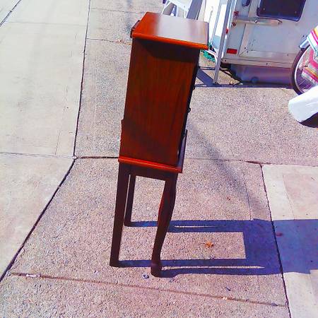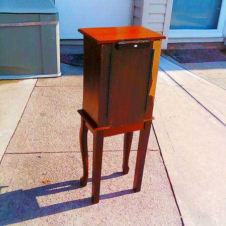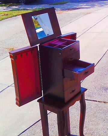 Jewelry Armoire Has 4 drawers, 2 side doors and opening Top Flip Mirror inside. Measures 34.5" tall x 13.5" wide x 8 1/2" deep.