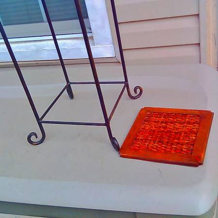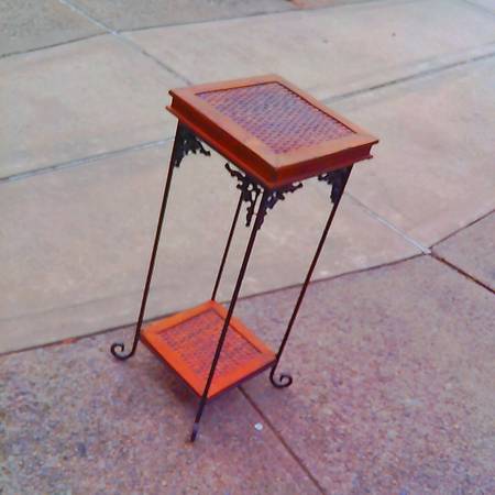 Small side table Woven Wooden Top and Metal Leg base This is used in Good condition, See all My Pic's for a Better Look 2-Tier Side Table, Wooden End Table with Wrought Iron Metal Legs and Ornate...