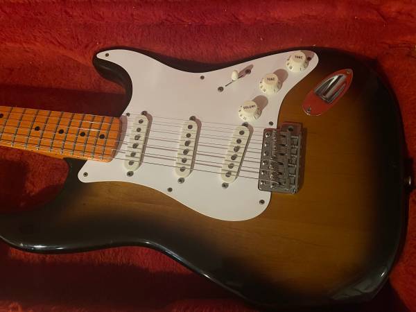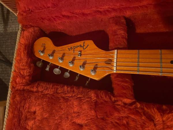 1984 Fender Fullerton’57 Reissue Stratocaster in near mint condition. No checked or signs of play wear. One ding on the bass side of the headstock (see picture). Includes all case candy including the original receipt. Pictures show neck date and there are pictures from underneath the pickguard showing the pickups. Very few of these models in this condition. Cash only. No trades.