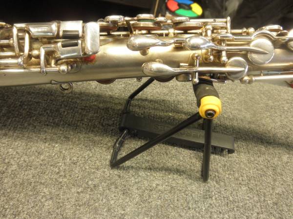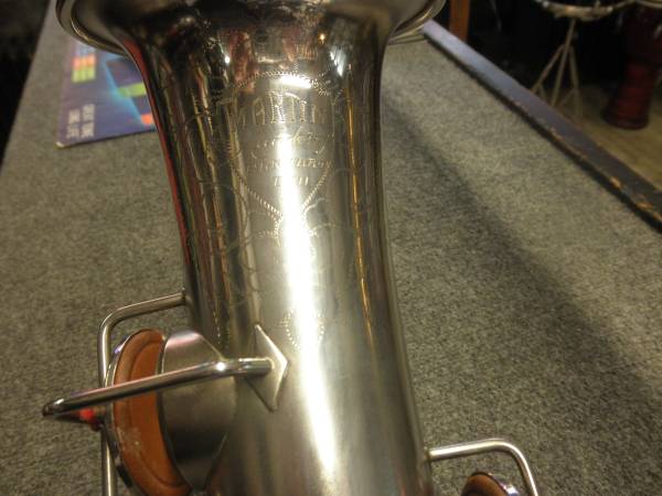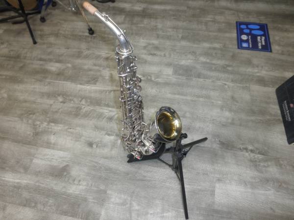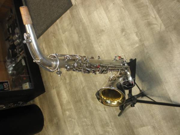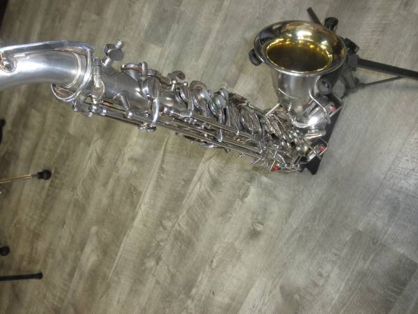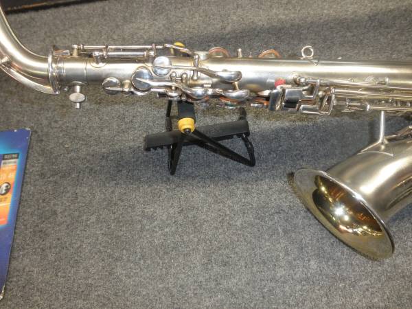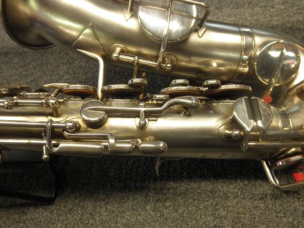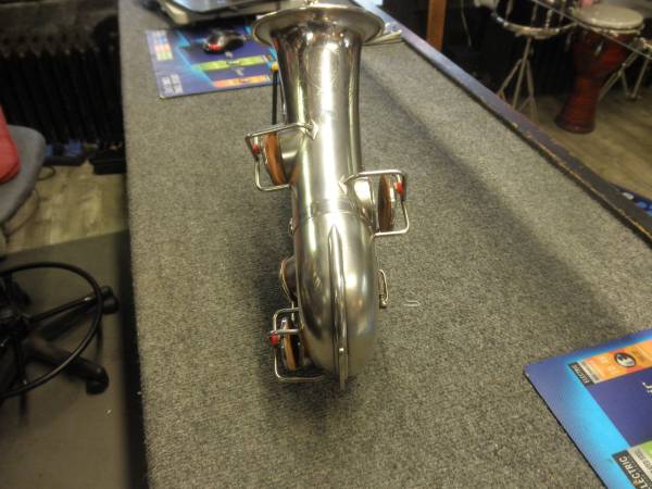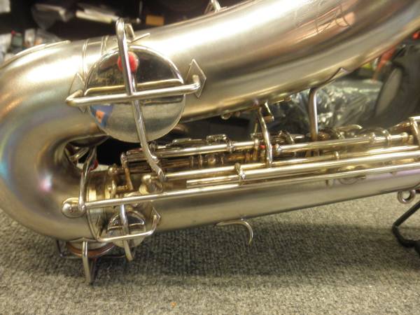 The body is silver-plated with a gold-plated bell, and has no dents nor dings.,pads are in good shape, plays well ,