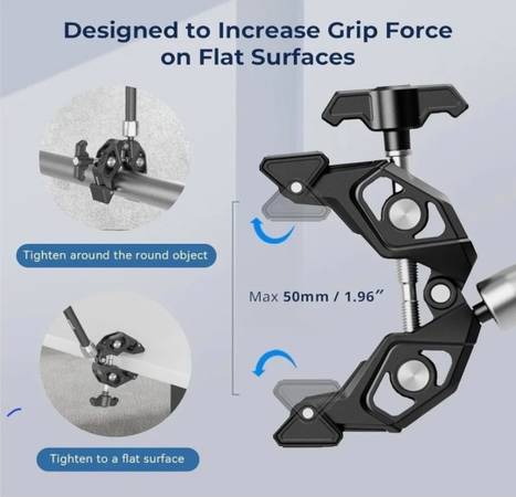 【Designed to Increase Grip Friction】The crab clamp now features a flexible rotating triangular prism friction block, enhancing the grip on flat surfaces. Ideal for clamping on the edge of a table, while also suitable for gripping round tubes like tripods, handheld ring grip, and more.