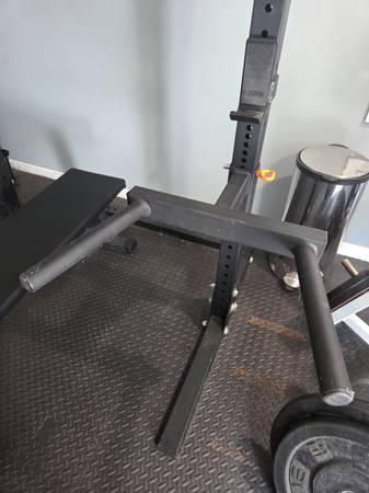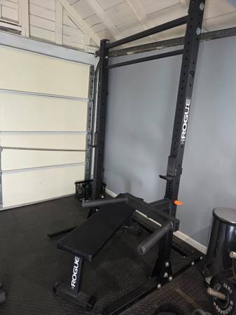 Rogue Lite Monster Squat Rack. Including a Matador dipping station, pull up bar, and ROGUE Flat bench. Barely used.