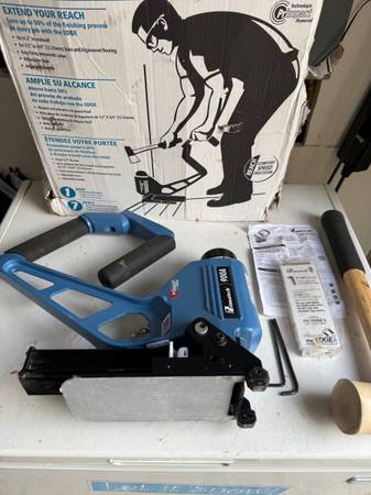 USED FOR A FEW JOBS. ITS A LIFESAVER. COMES WITH MALLET AND NAILS https://floormechanics.com/nailguns-cleats-staples/primatech-pneumatic-nailer-the-edge/