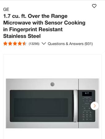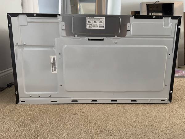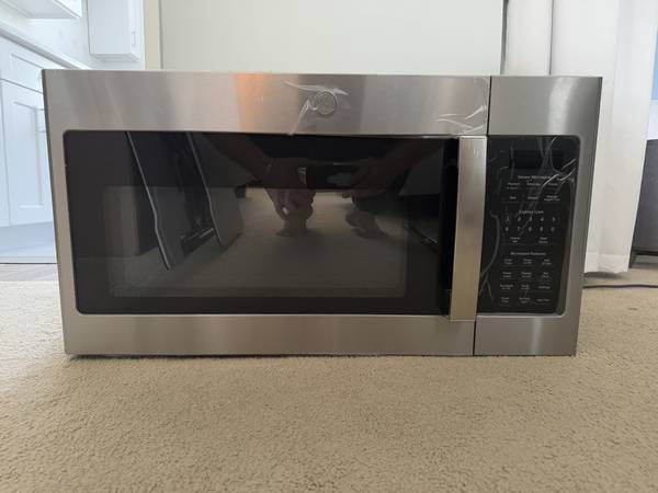 New GE Microwave, has a dent and item is unpackaged but completely unused. It simply did not fit in our kitchen. Dent occurred during shipping from Home Depot.