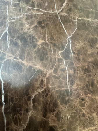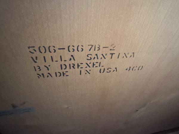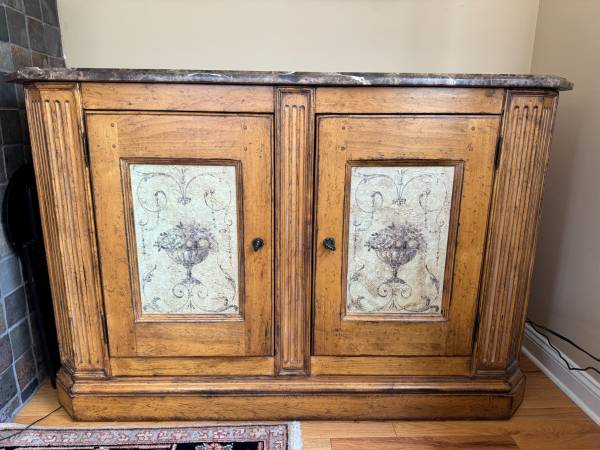 A marble top ‘Villa Santina’ buffet by Drexel. Top of the buffet is made from a brown and white tone marble slab and has an ogee edge. Buffet is made from a light tone wood with an intentionally distressed finish. The doors on the front of the buffet have an inset decorative feature. Interior of the buffet has two shelves. Marked ‘Villa Santina by Drexel’ ‘Made in USA’ on the back of the buffet.
