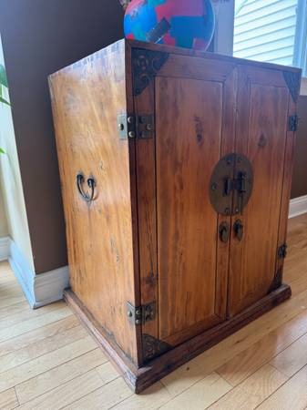 Original cast brass campaign hardware with large side hinges and traditional Chinese-inspired latch plates