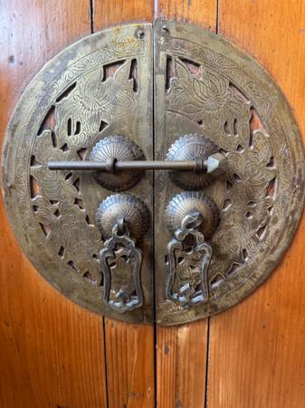 Deeply figured wood grain with a hand-rubbed oak veneer Two-panel doors with spacious and well-proportioned interior, top drawer, and two bottom drawers. Original cast brass campaign hardware with...