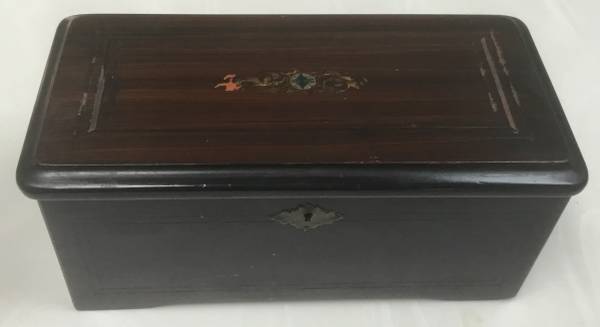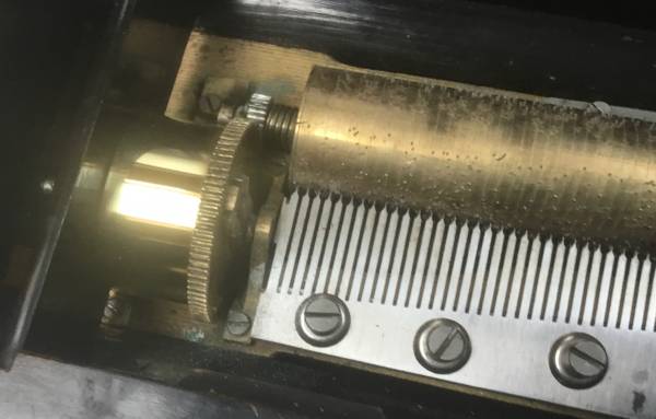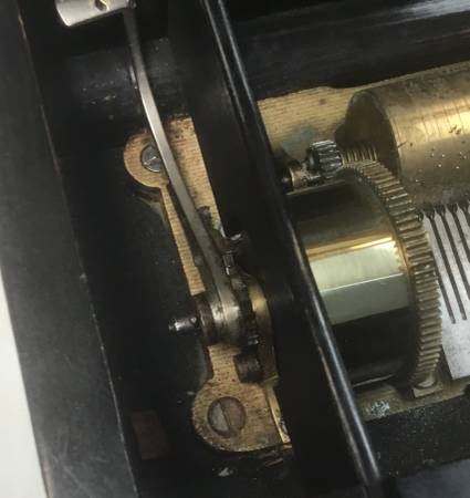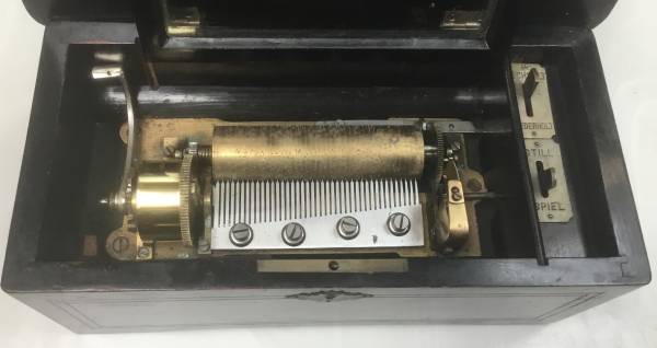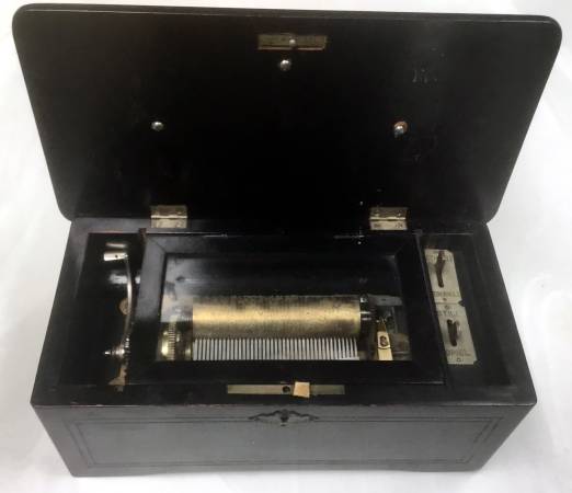 An antique cylinder music box from the late 1800s. Believed to have been made in Switzerland and featuring 6 aires. It is complete with a perfect comb, clean cylinder, and a new mainspring. Recently cleaned and oiled, it plays beautifully. Stamped number 14225.