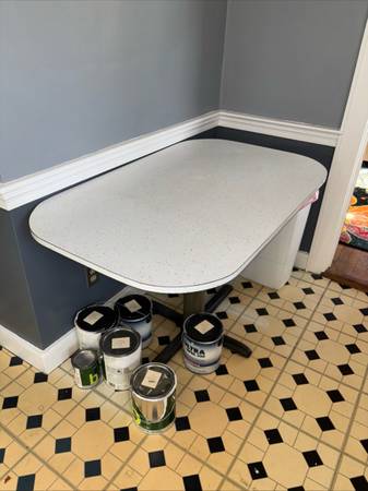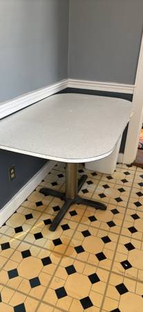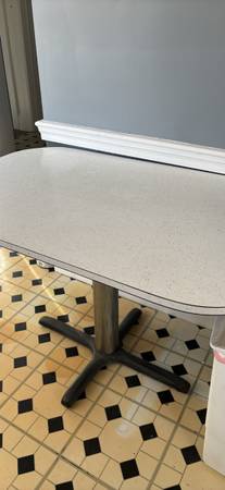 Amazing condition for its age, formica is intact. All around, base can use a cleaning and repainting. Buyer must be able to move and transport on pick up.