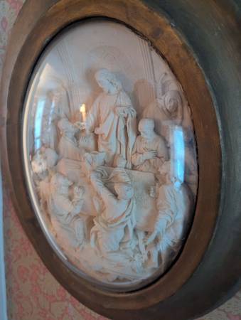 Chalkware plaque of The Last Supper dating to the early 1900s. Convex glass is in perfect condition. Third generation owner now needs to downsize.