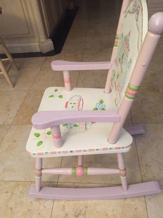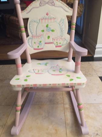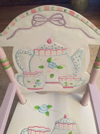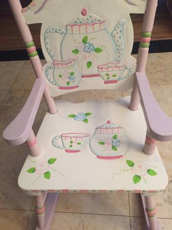 Very cute rocking chair to a girl, Tea time theme. 30"H x 17"wx22 1/2" Deep Excellent condition