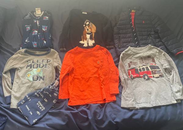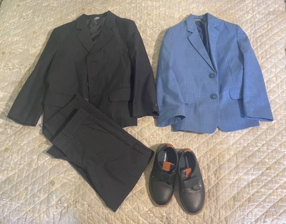 Selling gently used boy clothes size first four pictures are size 3t and 4t , 4 . Last pictures are size 5 and 6 . two blazers the black one is size 6 with the matching pants .45 Blue blazer is size 5 . The black shoes are size 10 . Selling it as a bundle