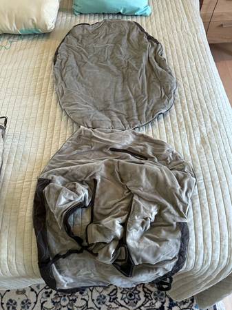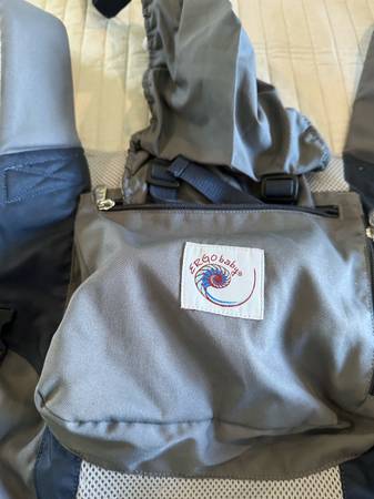 2. Urban Baby carrier: blue/grey, mesh, very comfortable, comes with organic insert and extra pad for tiny new babys. We also used the insert to protect/ carry new baby in the house. It wraps like a burrito. In great condition, note- 3 position system for baby- can be on front, hip, or back. This version does not allow baby to face front. Price is $25